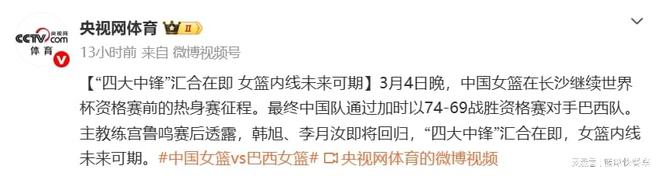 在过去几年里,中国队四大中锋从未联手,这一次世预赛,女篮四大中锋却有望联手。根据宫鲁鸣透露,韩旭已经回到国内,应该会在最近一两天内与中国队汇合。而李月汝也即将回来与中国队汇合。在这两大王牌中锋归队后,中国队也将迎来最强阵容。此前,韩旭曾和张子宇联手过,也曾和刘禹彤联手不过,不过,李月汝却从未与刘禹彤和张子宇联手过,这一次四大中锋联队,确实是看点十足。